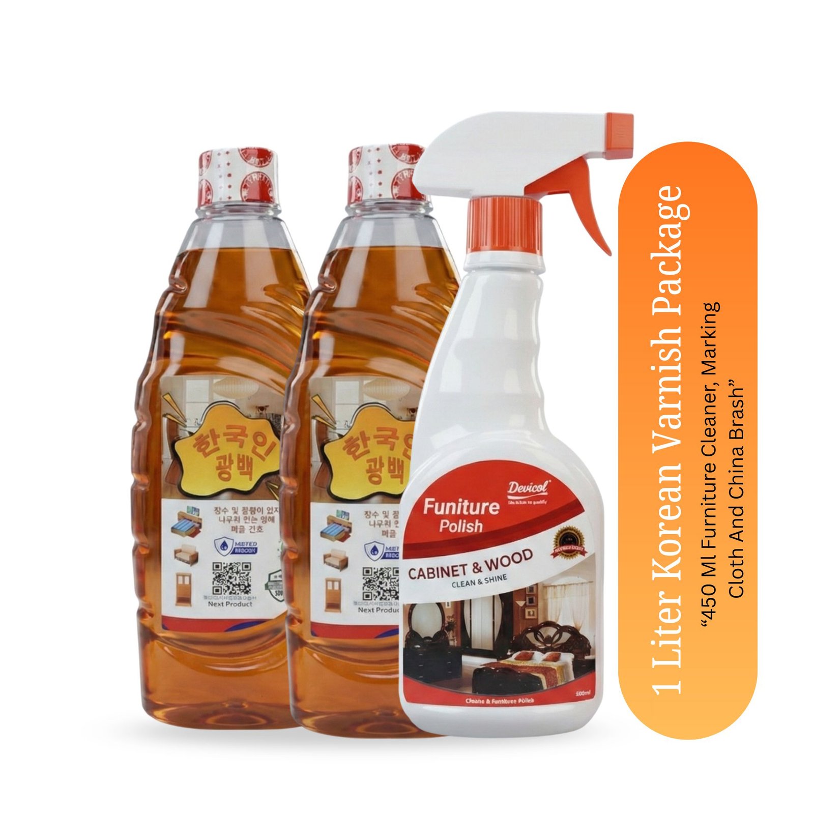 • ১ লিটার কোরিয়ান বার্নিশ + ৫০০ মিলি. ফার্নিচার ক্লিনার + মার্কিন কাপড় + ১.৫” ব্রাশ